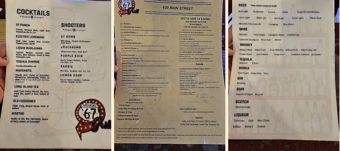 67 Grill rests at 629 Main St, Arkadelphia, AR. It’s a welcoming spot that combines a casual atmosphere with excellent food. With a price range of $10 to $20, it caters to diverse tastes. Diners can enjoy a variety of delicious meals and local specialties while relaxing with friends or family.